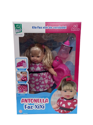 Boneca Antonella Faz Xixi – Super Toys Linda bonequinha Antonella com cabelos longos e loiros. fabricada com material de qualidade a bonequinha é super fofa usa um vestido rosa vibrante, com acessórios lúdicos que deixam a brincadeira ainda mais legal. A boneca acompanha uma mamadeira que você pode colocar água e ela faz xixi e um penico.