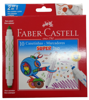 Canetinha Marcadores Super Duo com 10 unidades – Faber-Castell Canetinhas com cores super vibrantes com duas pontas. De um lado com ponta triangular possibilitando fazer traços mais finos e/ou mais grossos, e o outro lado com carimbos. Com 10 canetinhas com cores diferentes e carimbos diferentes.