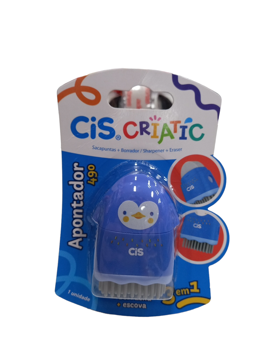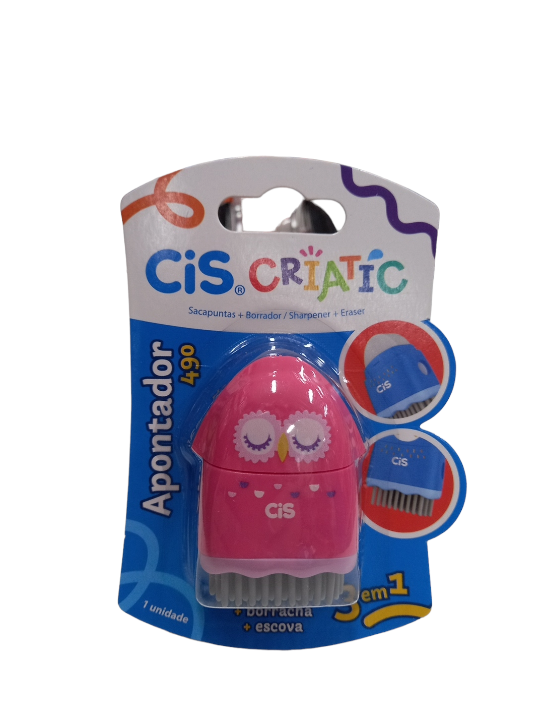 Apontador 3 em 1 Criatic – Cis Kit 3 em 1 com apontador, borracha e escova para limpar os farelos da borracha. Com personagens super fofos. O produto é super útil pois une 2 itens que se ocupam bastante. A borracha tem tampa o que faz ela ficar limpa e não sujar em contato com lápis.