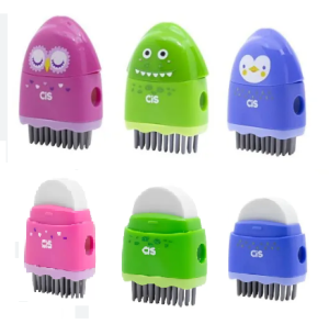 Apontador 3 em 1 Criatic – Cis Kit 3 em 1 com apontador, borracha e escova para limpar os farelos da borracha. Com personagens super fofos. O produto é super útil pois une 2 itens que se ocupam bastante. A borracha tem tampa o que faz ela ficar limpa e não sujar em contato com lápis.