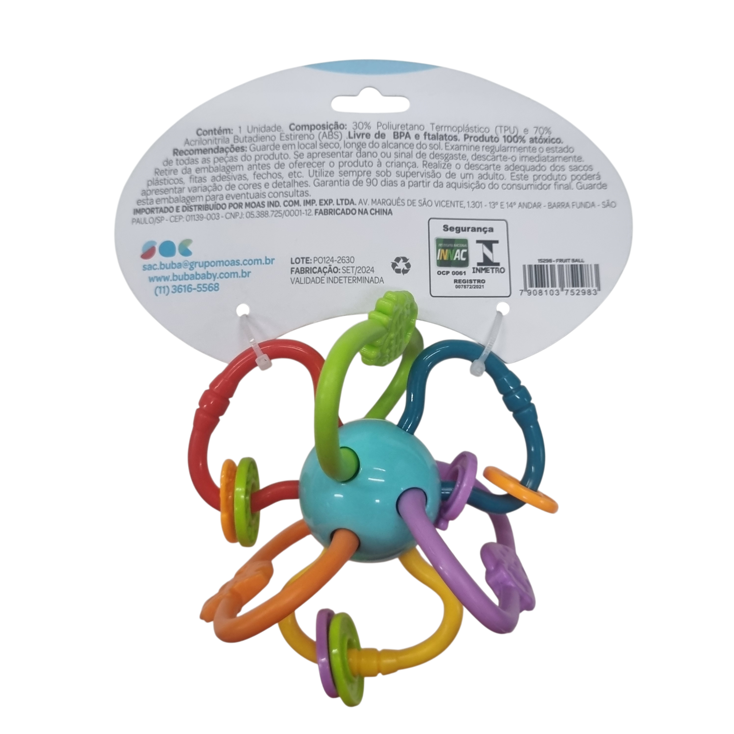 O Buba Fruit Ball é um chocalho mordedor interativo para bebês, com arcos flexíveis e texturas que estimulam os sentidos. Ideal para a fase de dentição, ele é leve, fácil de segurar e ajuda a aliviar o desconforto das gengivas com segurança.