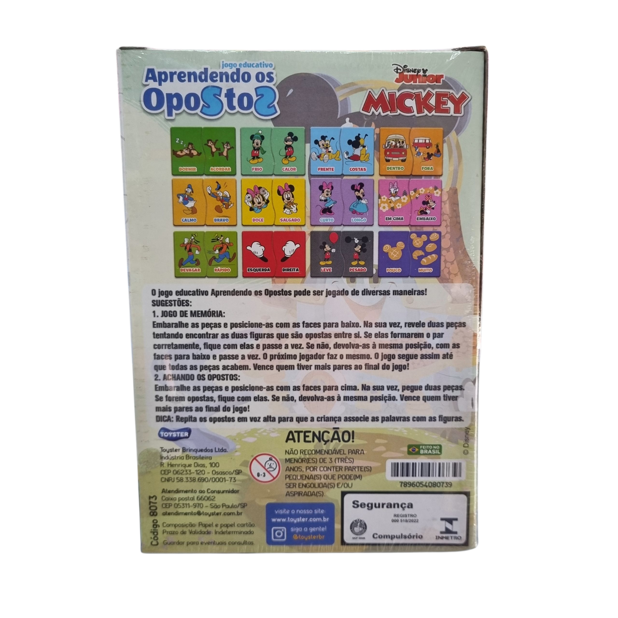 Um jogo da memória composto por 12 pares de palavras com sentido oposto, onde o objetivo é encontrar seus devidos pares. As cartas são coloridas e possuem imagens do Mickey representando cada palavra. O jogo auxilia no raciocínio lógico e no processo de alfabetização de forma lúdica e interativa para crianças, ideal para jogar em família.