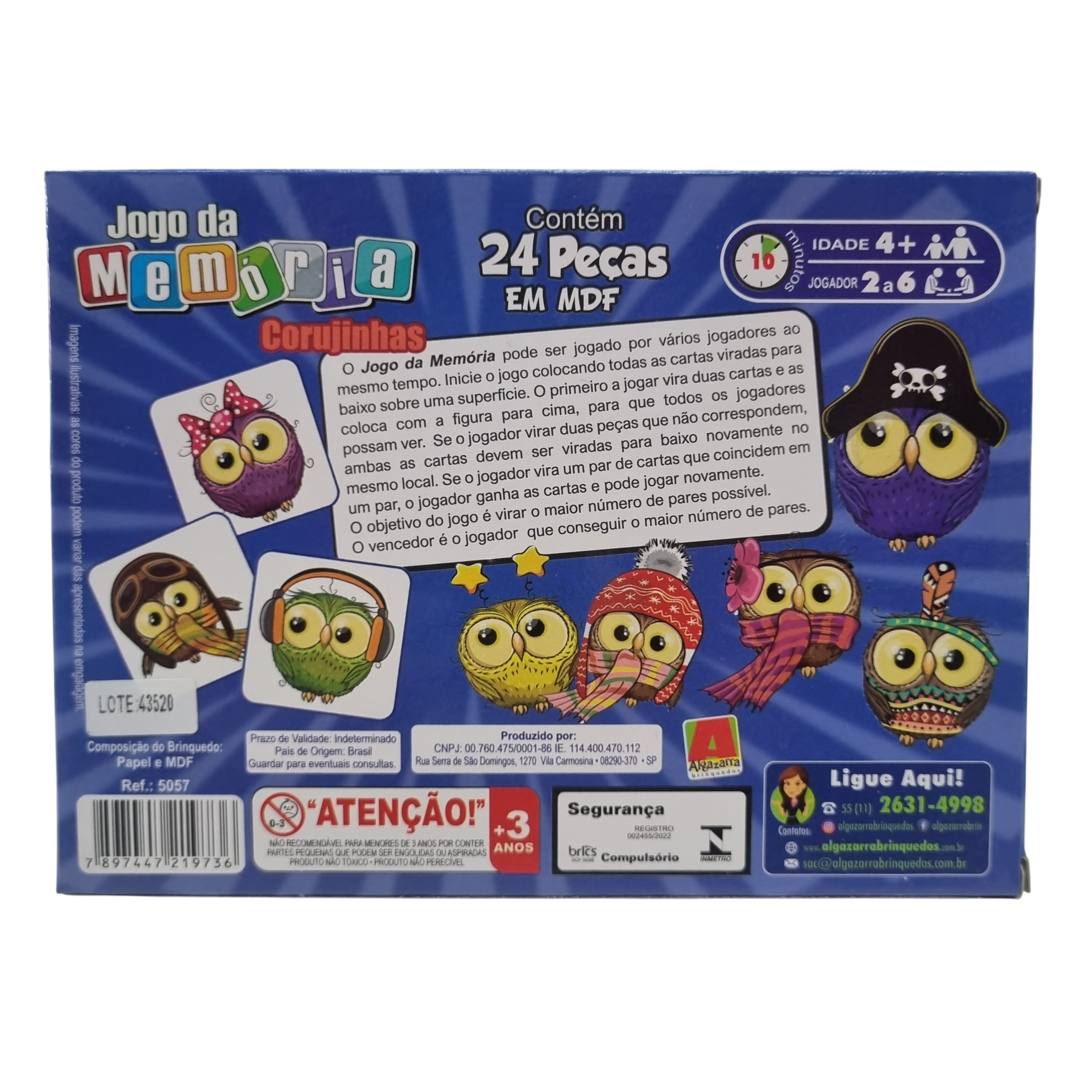 O Jogo da Memória Corujinhas 24 Peças – Algazarra Brinquedos estimula a concentração, a memória e o raciocínio de forma simples e divertida. Com 24 peças em MDF resistente e imagens coloridas encantadoras, é perfeito para brincar em família ou com amigos, proporcionando momentos de aprendizado e diversão para dois ou mais jogadores.