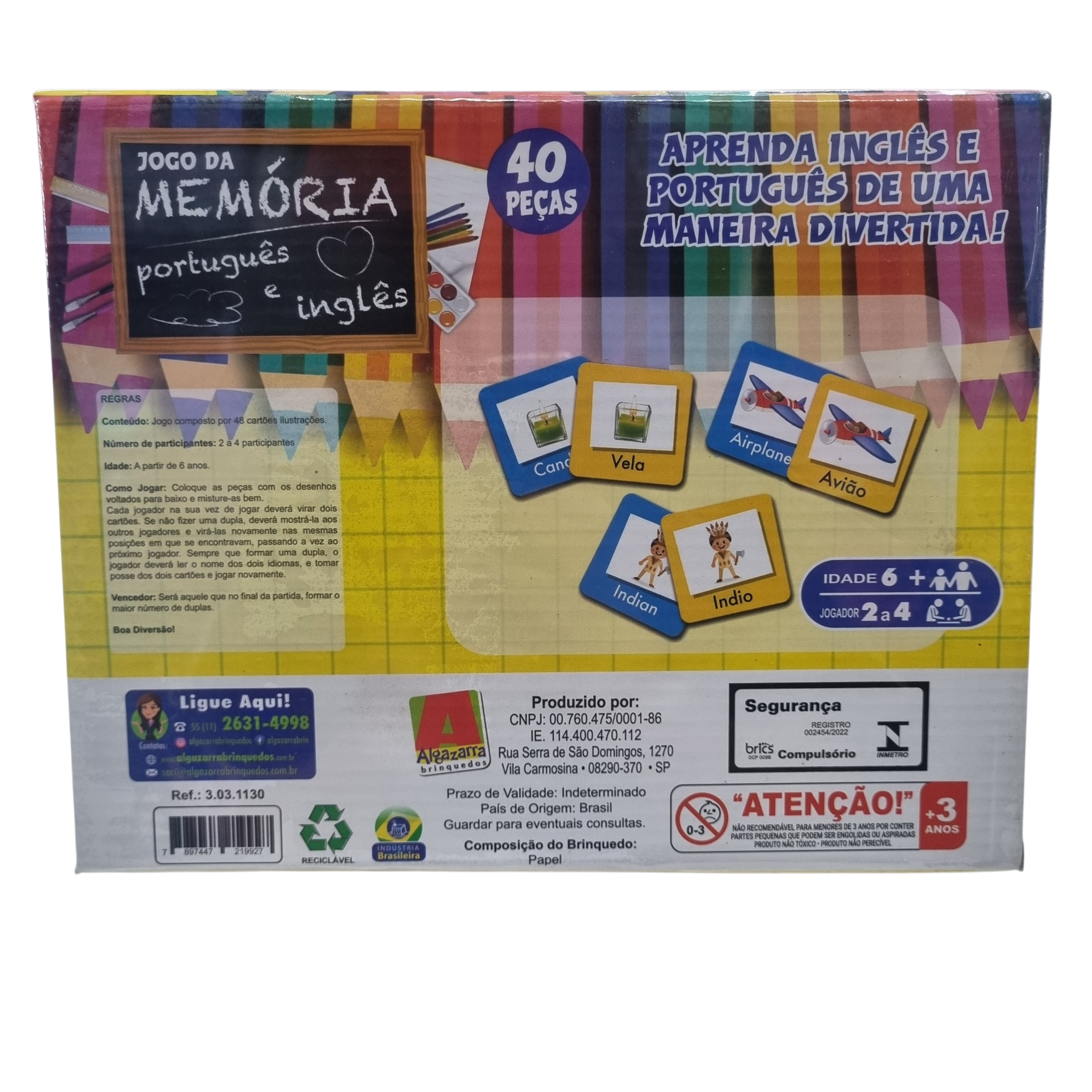 O Jogo Memória Português e Inglês da Algazarra Brinquedos é um jogo educativo que ajuda crianças a aprender palavras em dois idiomas enquanto se divertem formando pares de cartas. Com peças ilustradas de boa qualidade, estimula memória, concentração e vocabulário de forma lúdica. Perfeito para jogar em família ou na escola.