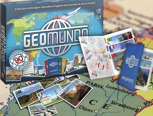 Jogo de Geografia Geomundo – Grow, ” Embarque nesse jogo e descubra os lugares mais incríveis do mundo! Peque uma carta e tente descobrir em, qual território aquele local está. Se acertar, poderá responder uma pergunta dos diversos temas ligados à geografia e cultura em geral que a carta contém. Acertando, você ganha a carta que serve como carimbo em seu passaporte! De uma maneira inteligente e gostosa os participantes vão descobrindo e reconhecendo cidades, grandes monumentos e paisagens importantes como se estivessem viajando pelo mundo e experimentando toda a cultura que ele nos oferece.”