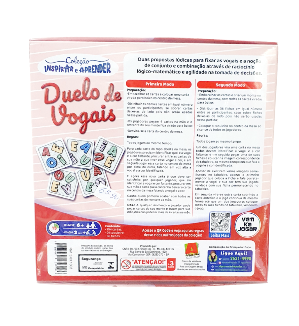 Jogo Educativo Duelo De Vogais – Algazarra Brinquedos Duas Propostas lúcidas para fixar as vogais e a noção de conjunto e combinação através de raciocínio lógico-matemático, uma forma de aprendizado muito mais divertida, podendo ter conhecimento das letras, formas e entre outras opções.