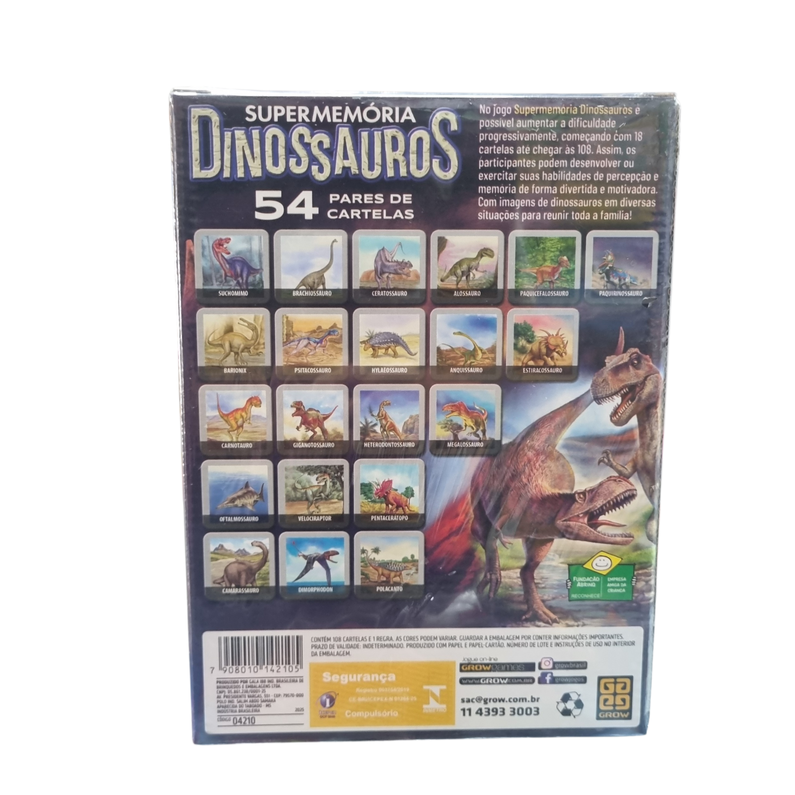 Jogo da memória da Grow com tema dinossauros, indicado para crianças a partir de 4 anos. Contém 108 cartas (54 pares) e desenvolve memória, concentração e raciocínio lógico de forma divertida. Ideal para jogar em família ou com amigos.