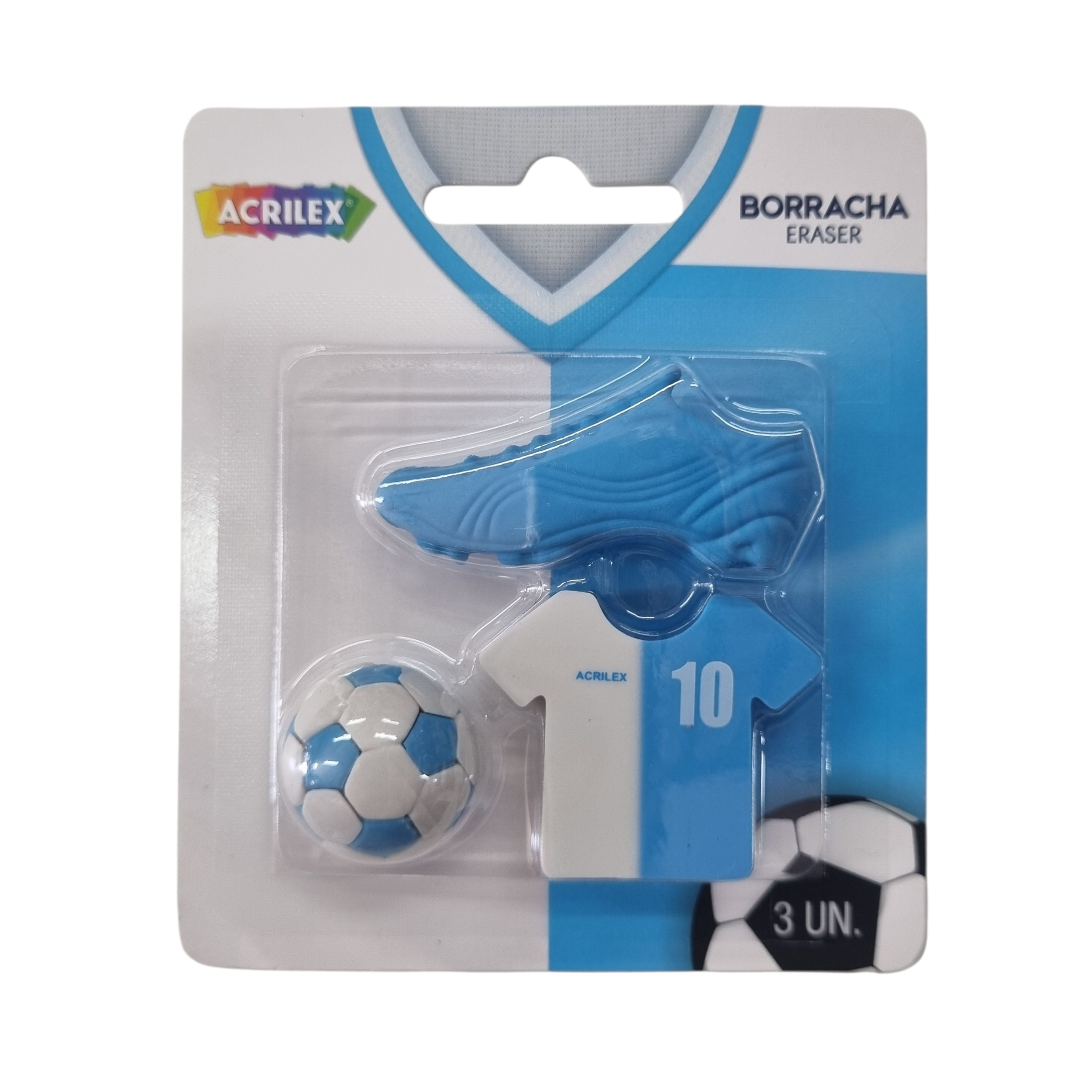 O Kit 3 Borrachas Futebol Acrilex conta com designs divertidos de bola, chuteira e camisa. Ideal para crianças, estudantes e fãs de futebol, é versátil e divertido, perfeito para uso escolar ou até em casa.
