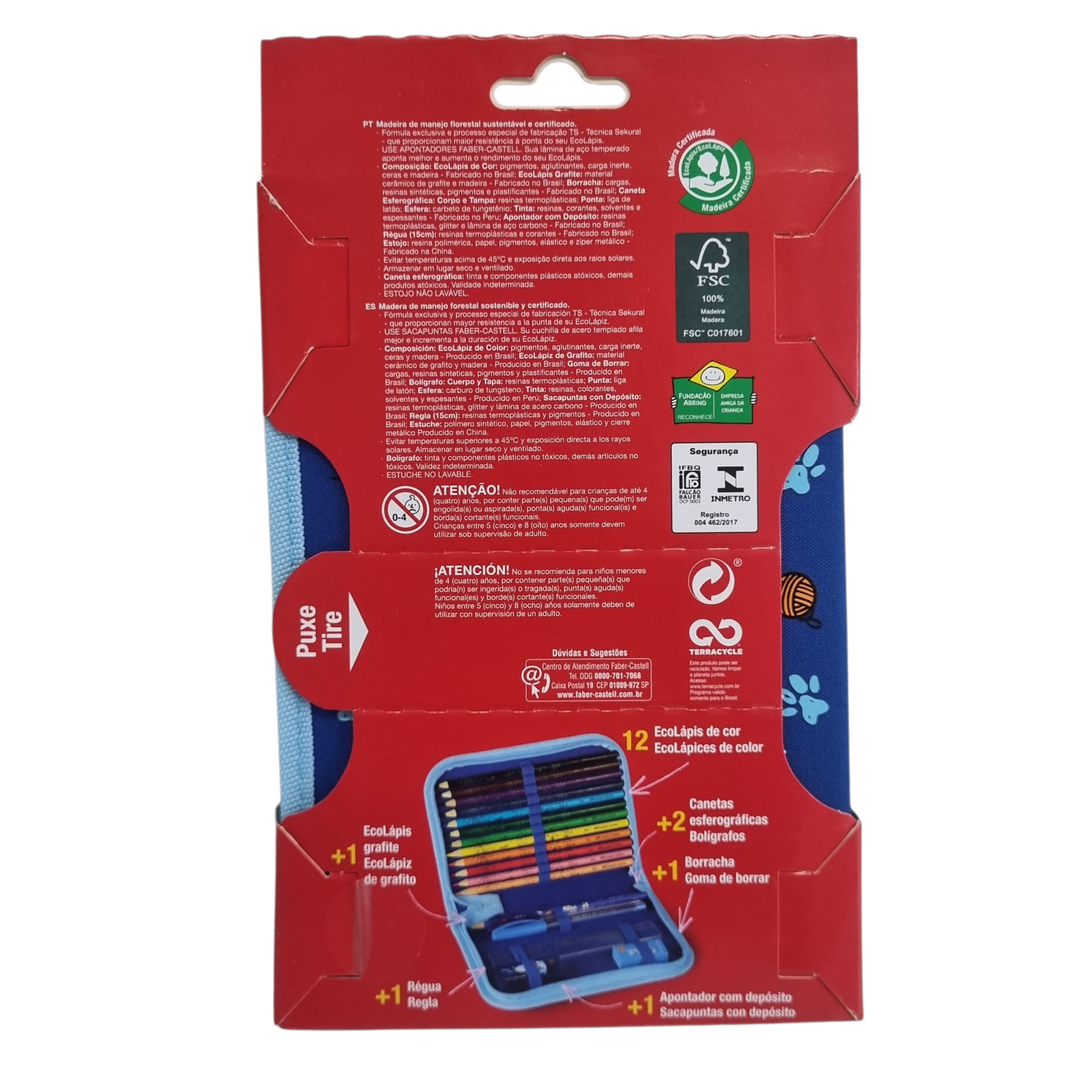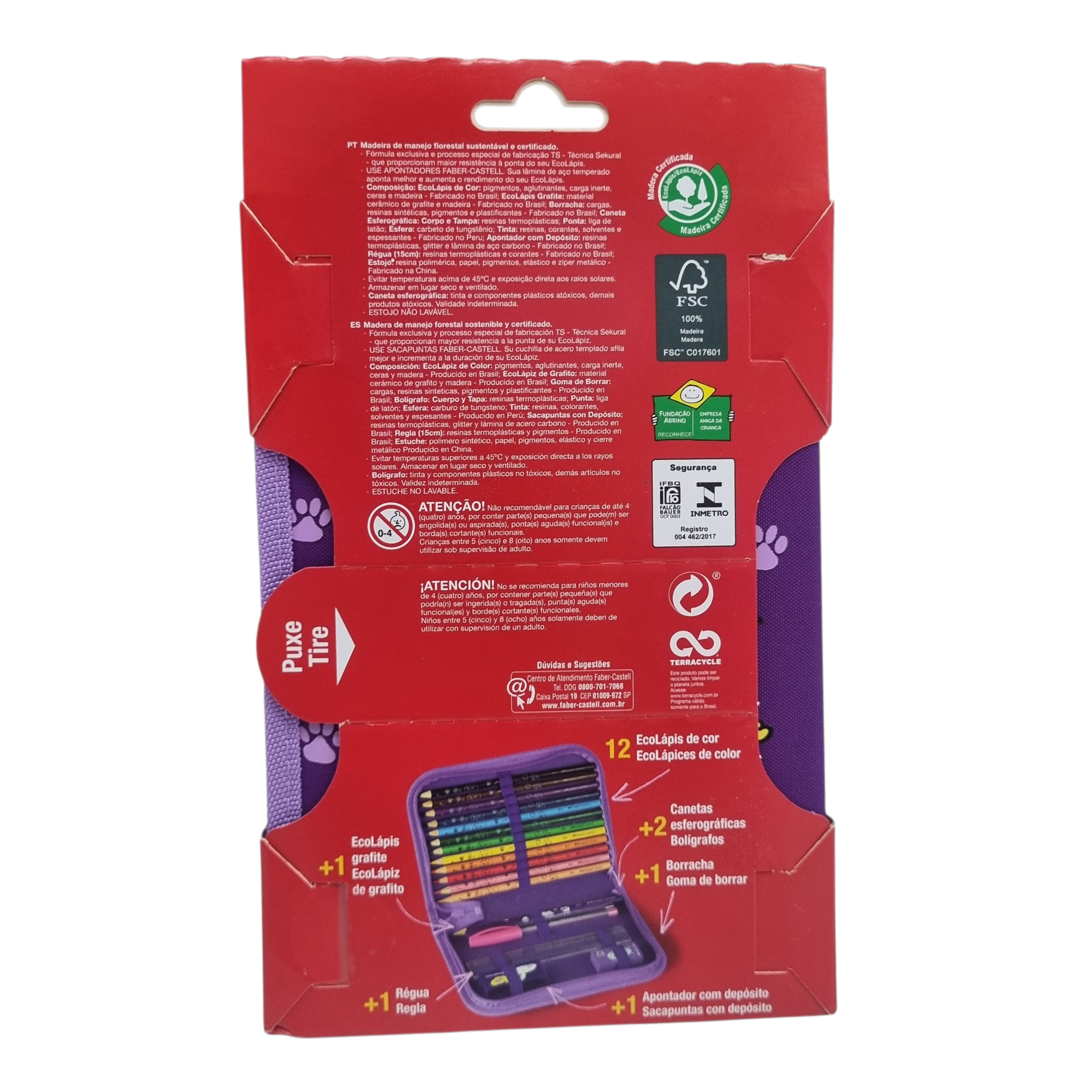 - Contém: 12 EcoLápis de cor, 2 Canetas esferográficas, 1 EcoLápis grafite, 1 Régua, 1 Apontador com depósito e 1 Borracha.