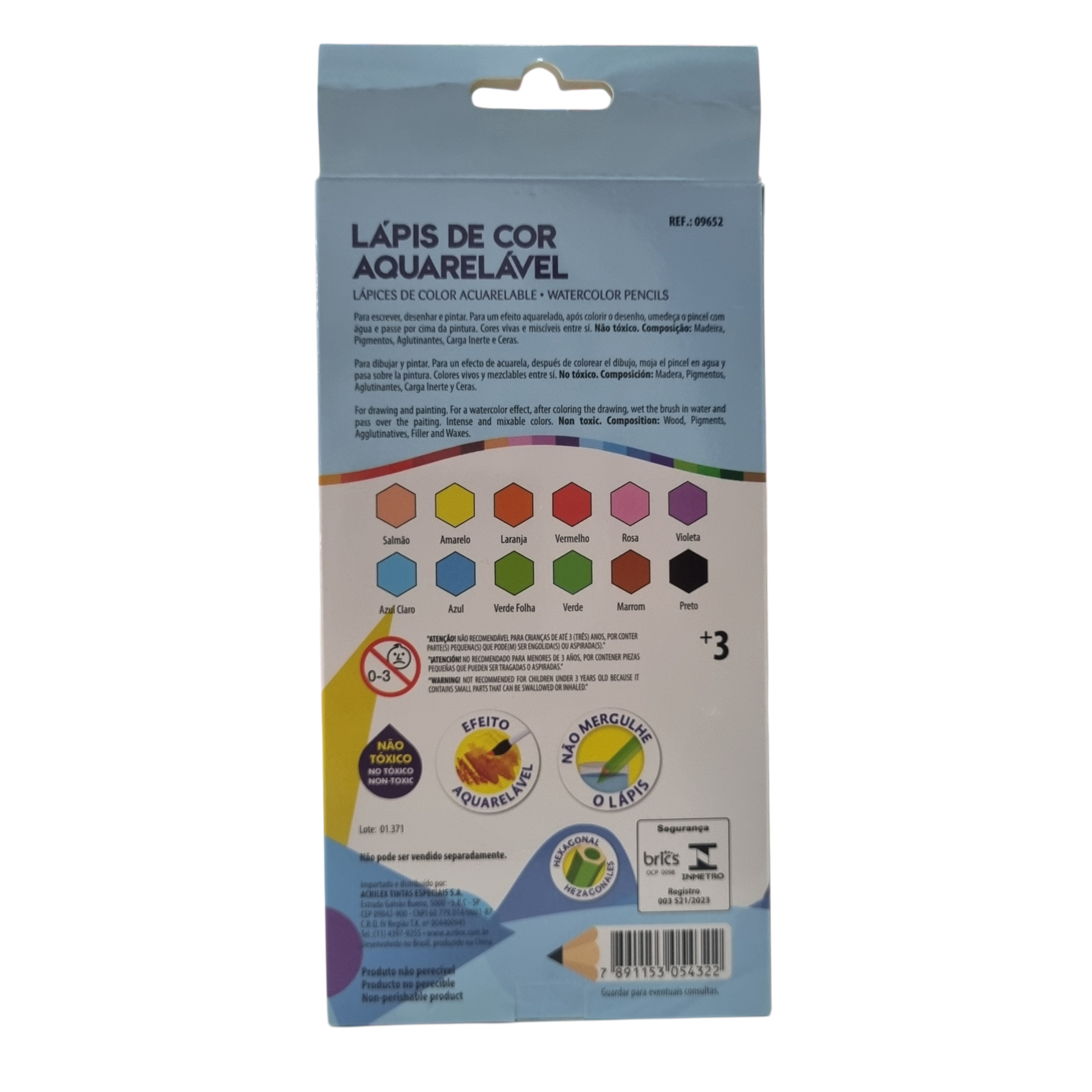 - Contém: 12 lápis de cor com efeito aquarelável e 1 pincel.
