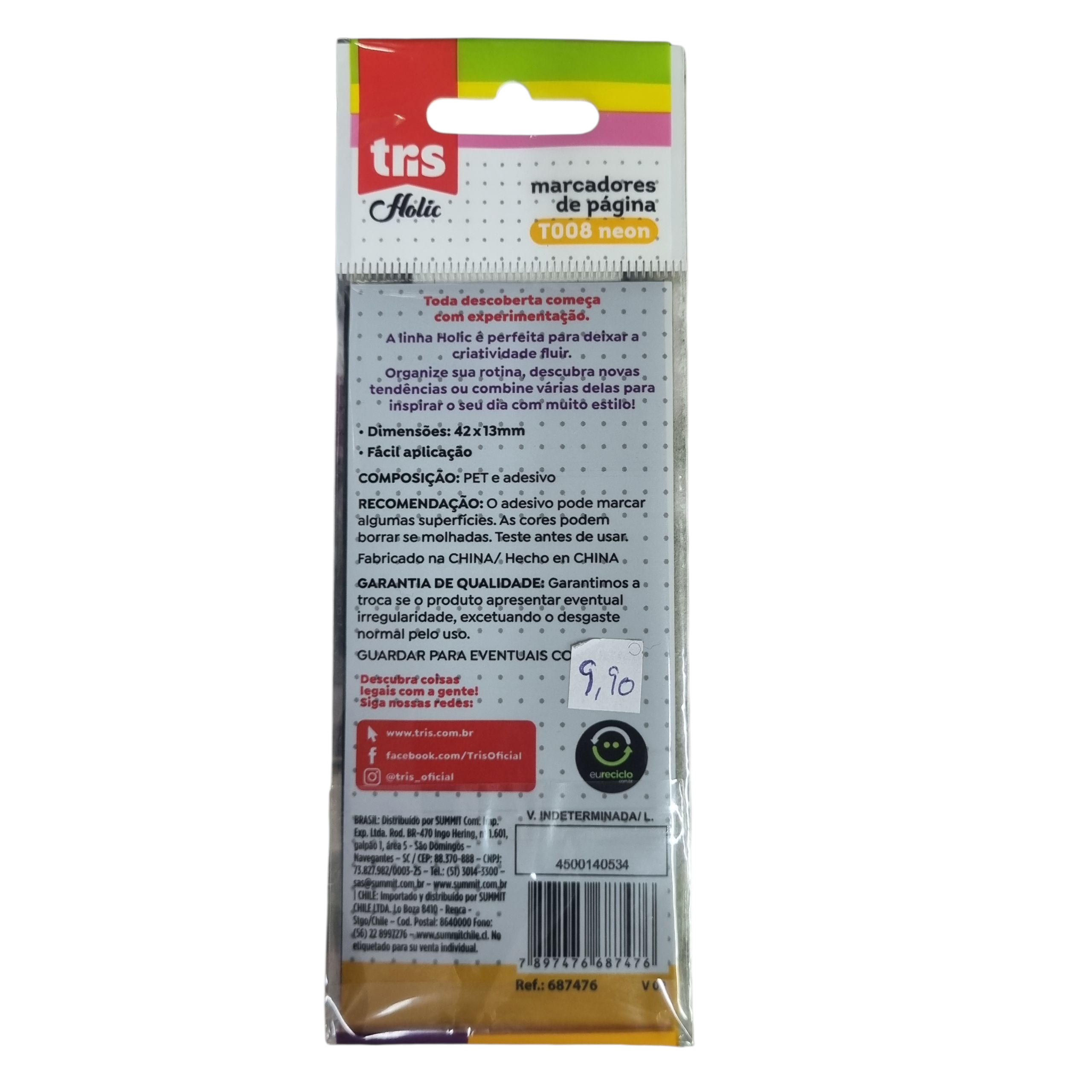 Os Marcadores de Página T008 Neon da Tris combinam estilo com praticidade, ideais para quem busca por organização e versatilidade nos estudos, no trabalho ou na leitura. Com 160 unidades autoadesivas e reposicionáveis, permitem marcar páginas, destacar trechos importantes e fazer pequenas anotações sem danificar o papel. Compactos e resistentes, são perfeitos para livros, cadernos, documentos e planejamentos, garantindo eficiência e estilo na rotina de quem precisa manter tudo em ordem.