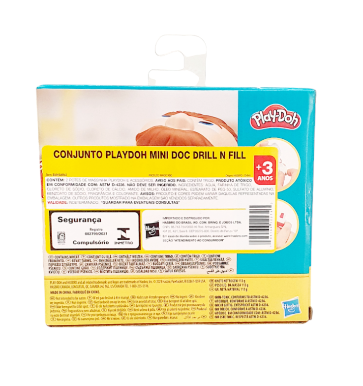 - Contém: um boneco, 2 potes de massinha, um molde para os dentes, escova de dentes e “furadeira”