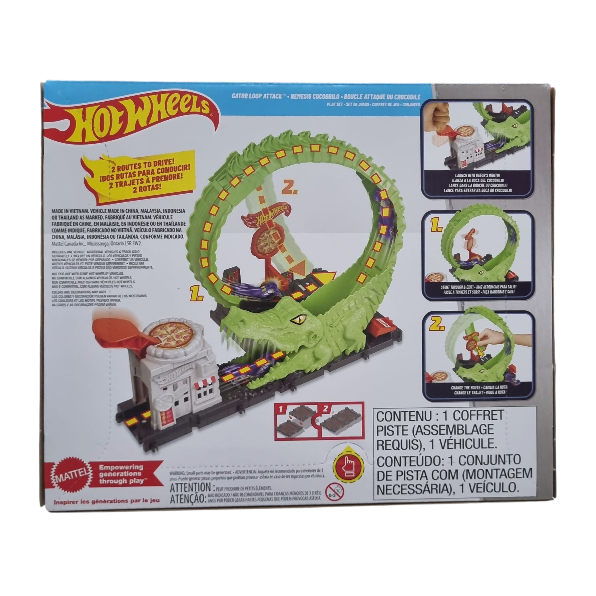 A Pista Hot Wheels City – Looping de Ataque do Crocodilo acompanha 1 carrinho em escala 1:64 e possui um design interativo com looping ajustável, efeitos visuais divertidos e conexões para expandir com outras pistas Hot Wheels. Indicado para crianças a partir de 4 anos.