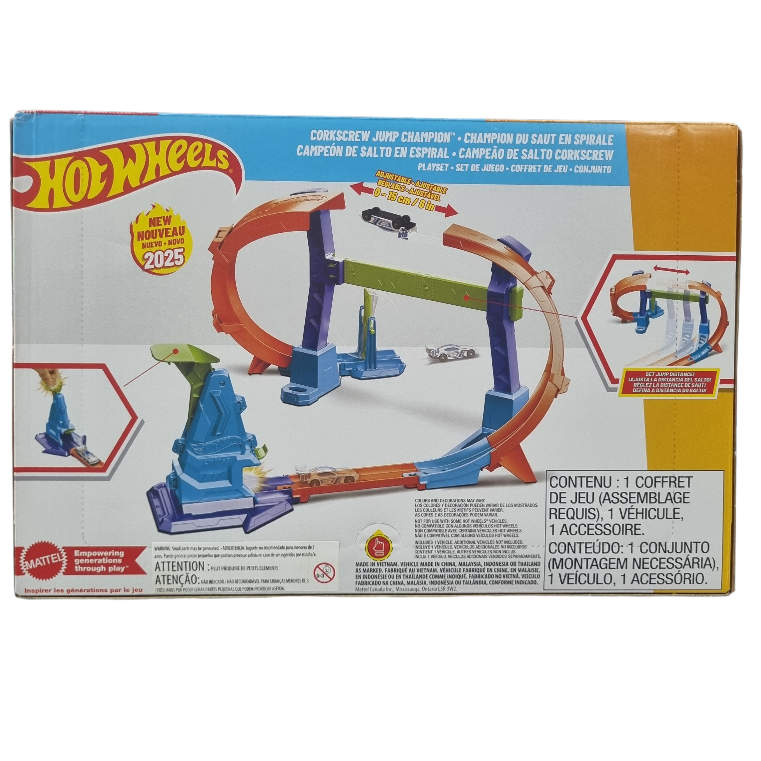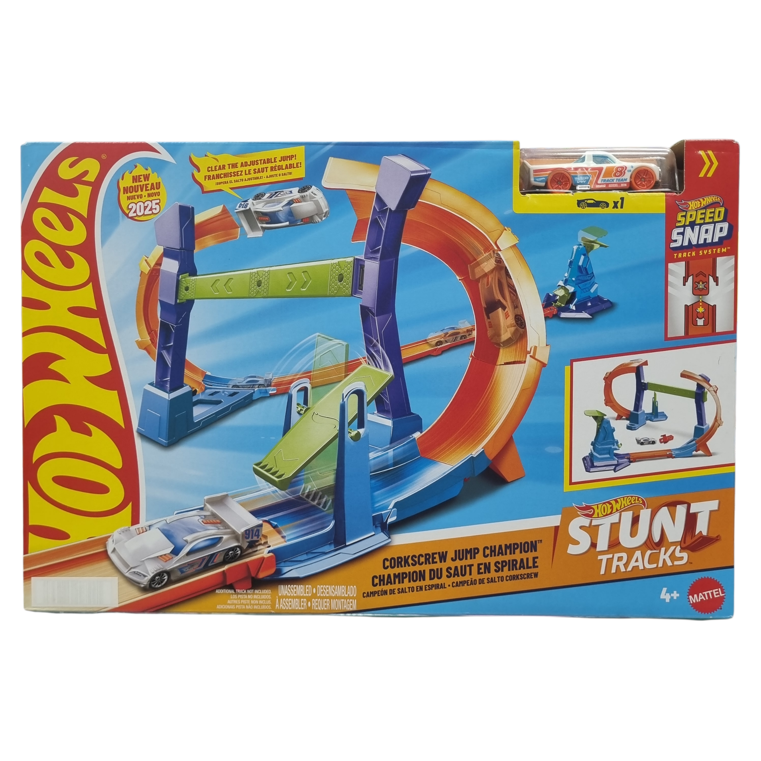 A Pista Hot Wheels Stunt Tracks Campeão de Salto Corkscrew – Mattel oferece acrobacias radicais com seu looping em espiral e salto em saca-rolhas. É ajustável e fácil de montar, incluindo 1 carrinho Hot Wheels e garantindo diversão com desafios de velocidade e precisão para crianças a partir de 4 anos.
