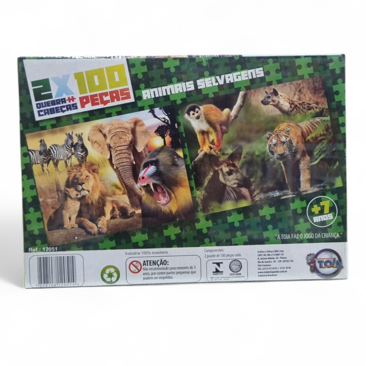 O Quebra-cabeça Animais Selvagens conta com dois desafios de 100 peças cada, trazendo ilustrações vibrantes de animais da vida selvagem. Ideal para estimular raciocínio, concentração e coordenação motora, proporcionando diversão educativa para toda a família.