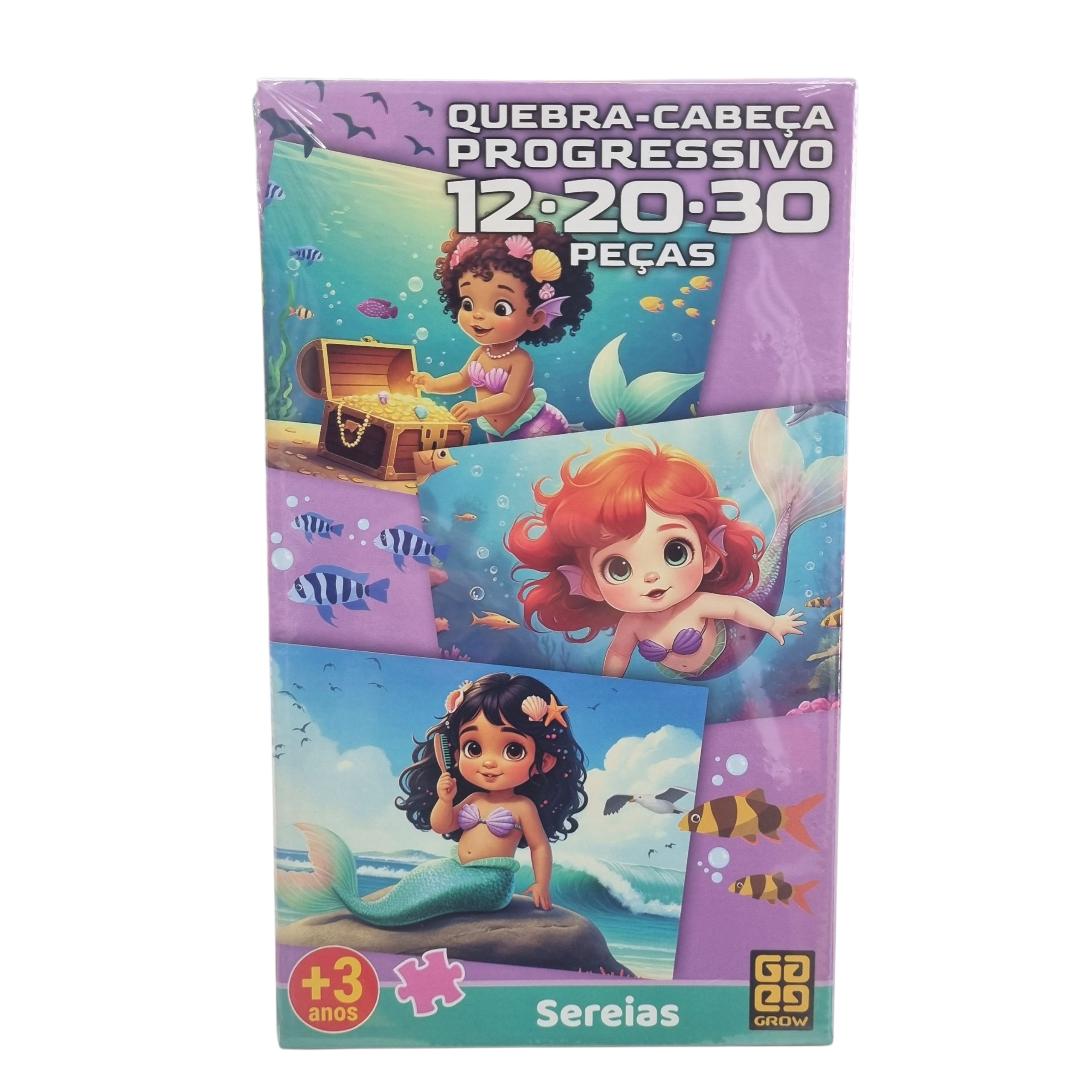 O Quebra‑Cabeça Progressivo Sereias da Grow traz três níveis de desafio para diferentes idades, com ilustrações encantadoras de sereias em ambientes subaquáticos. Permite que os pequenos comecem com poucos pedaços e avancem para montagens mais complexas, acompanhando seu desenvolvimento. Estimula paciência e concentração de forma divertida, ideal para montar com a família.