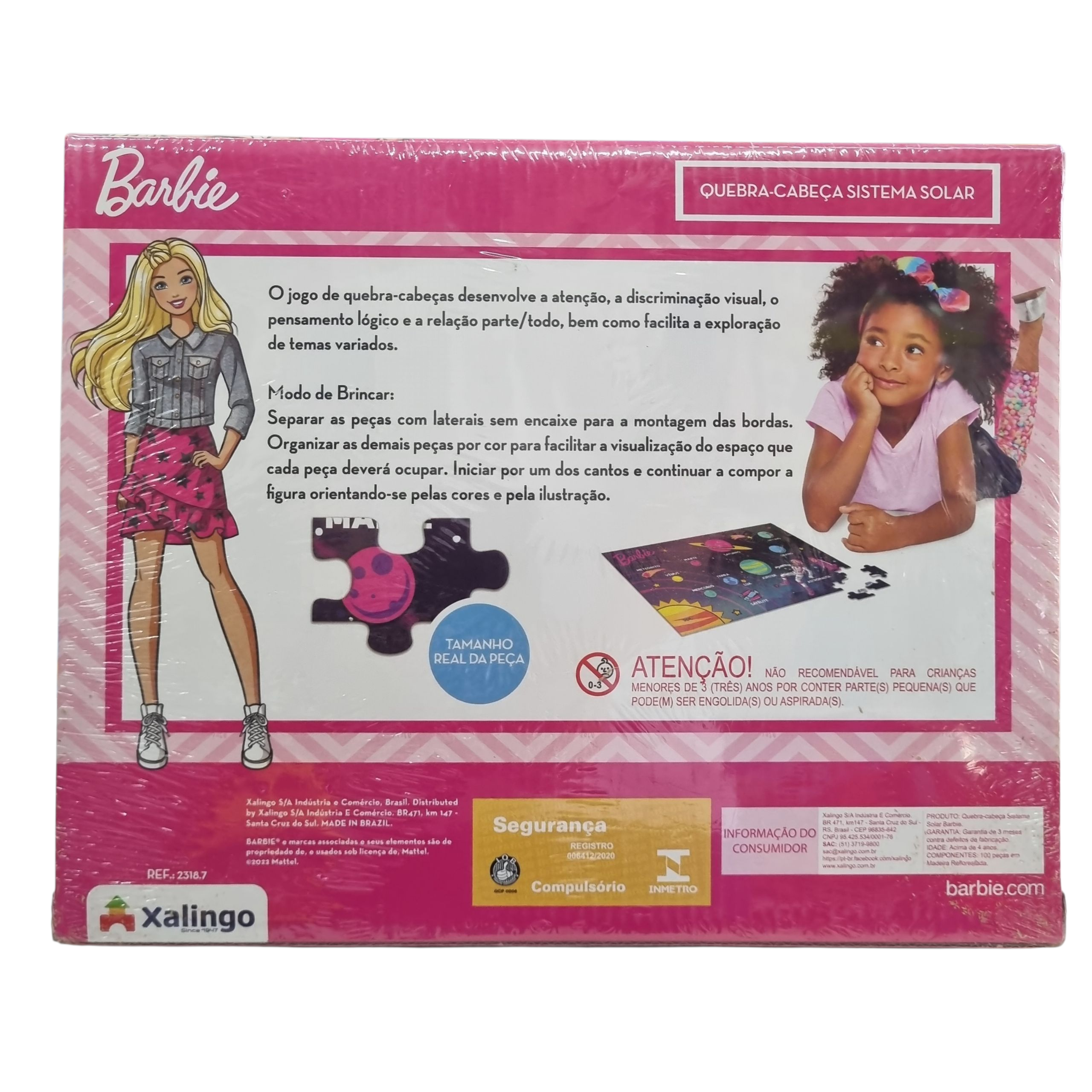 O Quebra-Cabeça Sistema Solar Barbie da Xalingo Brinquedos é um brinquedo educativo que estimula a coordenação motora e o raciocínio lógico das crianças. Composto por 100 peças em madeira reflorestada, apresenta uma ilustração vibrante do sistema solar com a personagem Barbie como astronauta. A montagem da cena de 40 × 27 cm proporciona diversão e aprendizado, sendo recomendado para crianças a partir de 4 anos. Ideal para presentear e incentivar o interesse pelo espaço e pela ciência de forma lúdica.