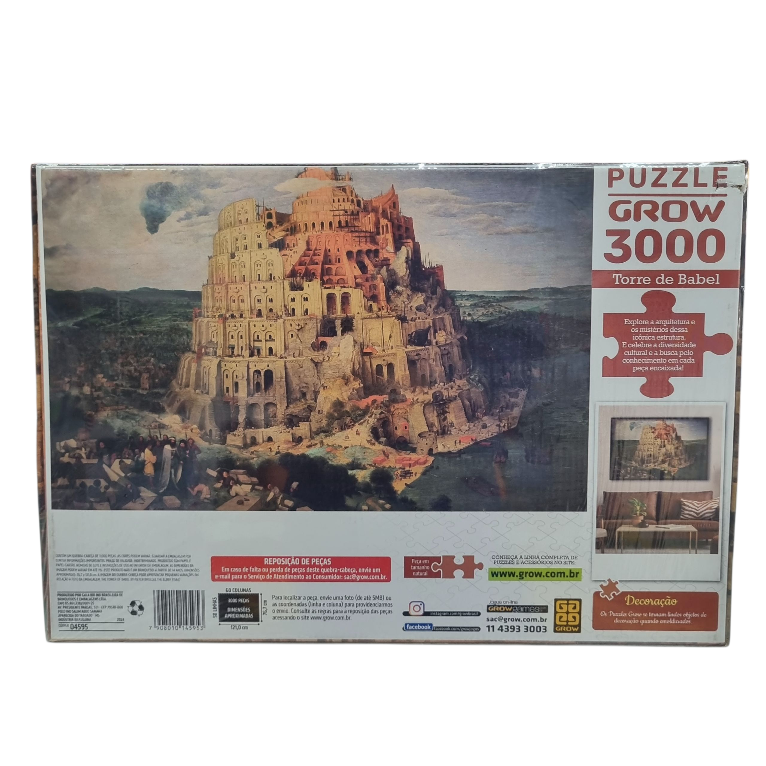 O quebra‑cabeça é inspirado na pintura “A Torre de Babel“ de Pieter Bruegel, retratando uma cena rica em arquitetura, história e muitas figuras. Com 3000 peças, apresenta uma montagem divertida, que exige paciência e bastante atenção aos detalhes, ótimo para montar com a família e amigos. Quando montado, a imagem mede aproximadamente 121,0 × 76,7 cm, perfeita para usar como decoração, dando um toque de único para seu ambiente.